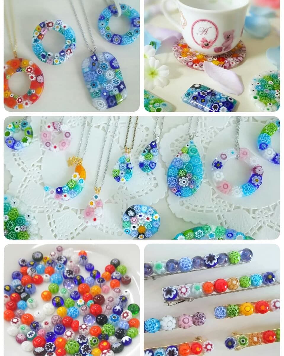ミルフィオリ(ヴェネチアンガラス)で、箸置きや、アクセサリー、ヘアクリップ、バレッタ等を制作しています。 【ミルフィオリとは・・・】 ミルフィオリはイタリアのヴェネチアで15世紀から作られている伝統工芸です。 ガラス細工の一種で、金太郎飴のように模様が入っているガラス棒を使用して作った製品の事で、イタリア語の「Millefiori」とは「千の花」という意味です。 お花の模様が敷き詰められていて、とっても可愛いですよ♡