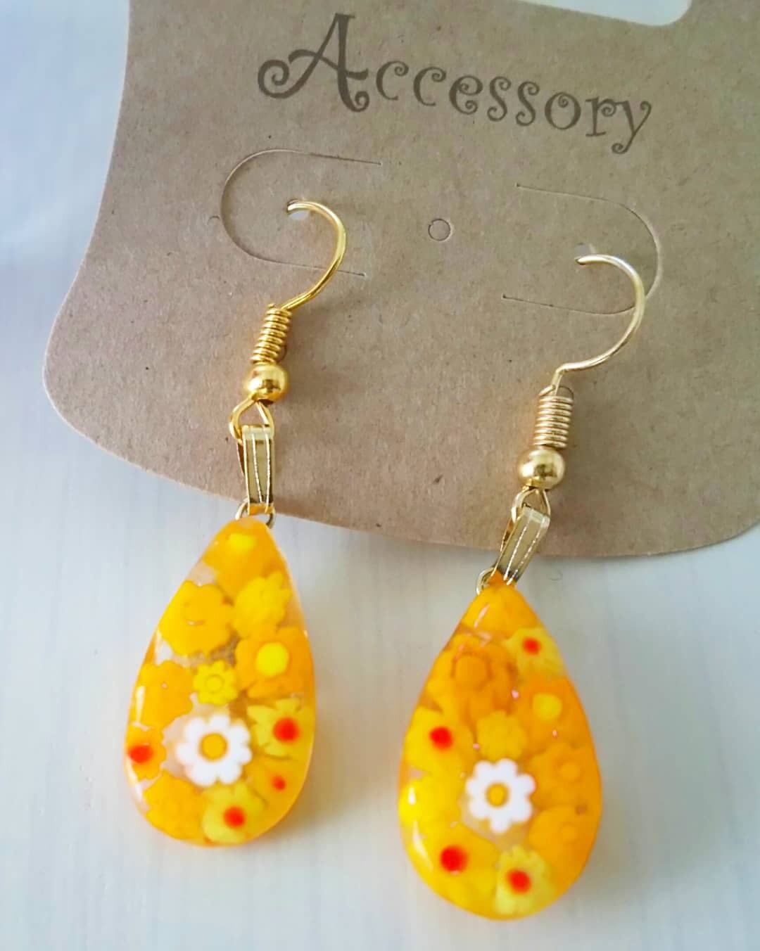 ミニしずく型のミルフィオリピアスまたはイヤリングになります。金具をゴールドにも変更可能です。