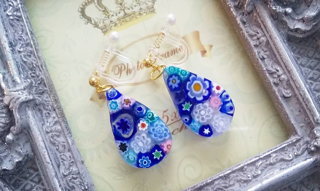 ミニしずく型のミルフィオリイヤリングになります。樹脂タイプなので、アレルギーの方でも安心してお使い頂けます。