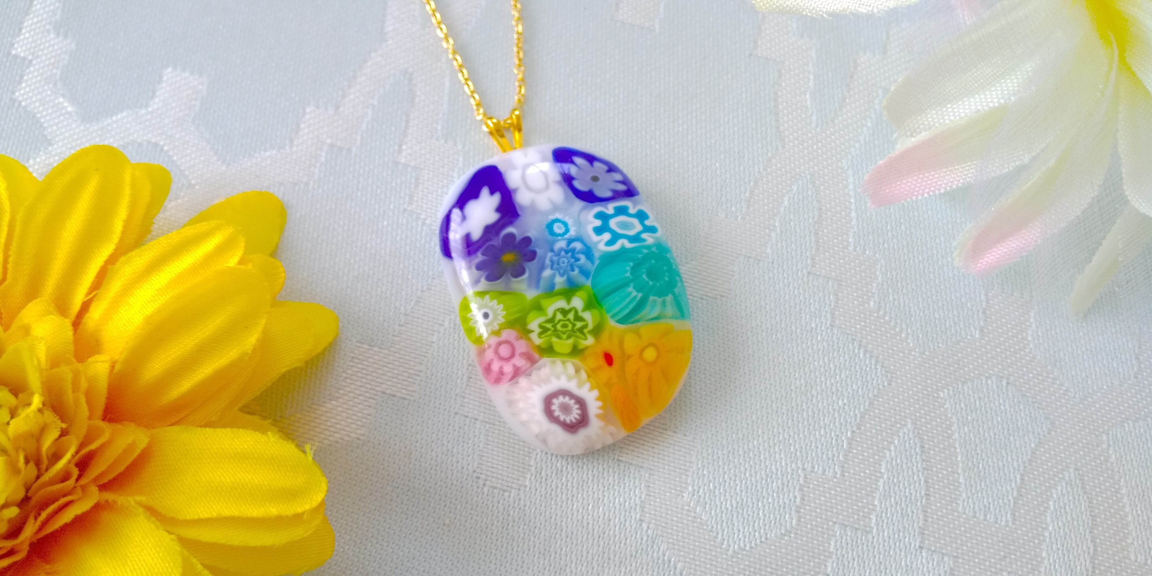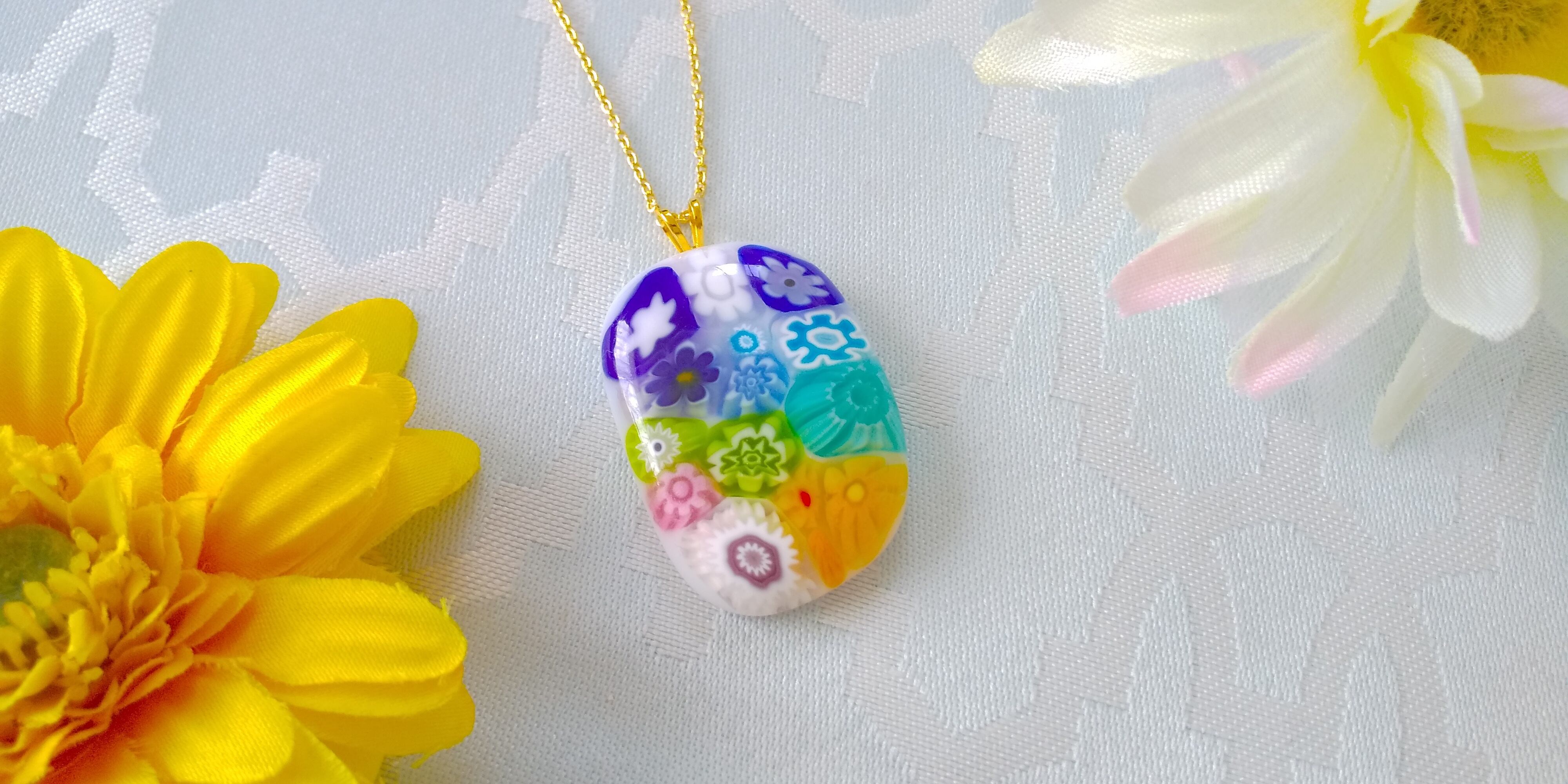 不透明なホワイトにカラフルなミルフィオリを彩った可愛らしいミルフィオリのネックレスになります。