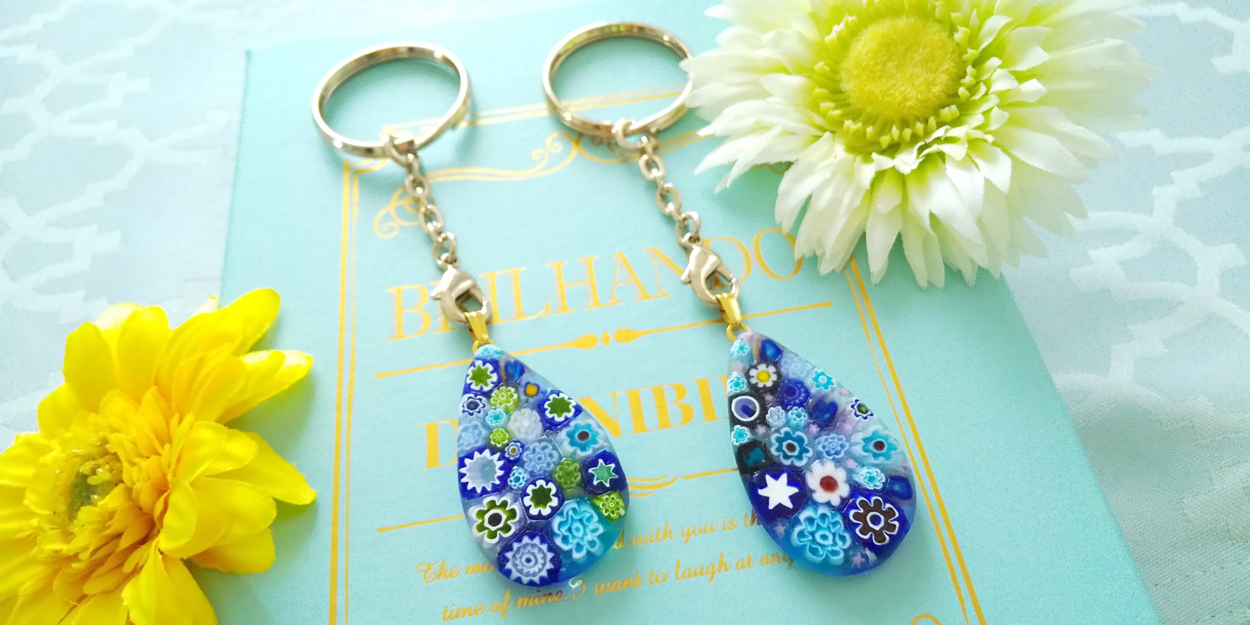 ガラス細工の一種で、金太郎飴のように模様が入っているガラス棒を使用して作った製品の事で、イタリア語の「Millefiori」とは「千の花」という意味です。