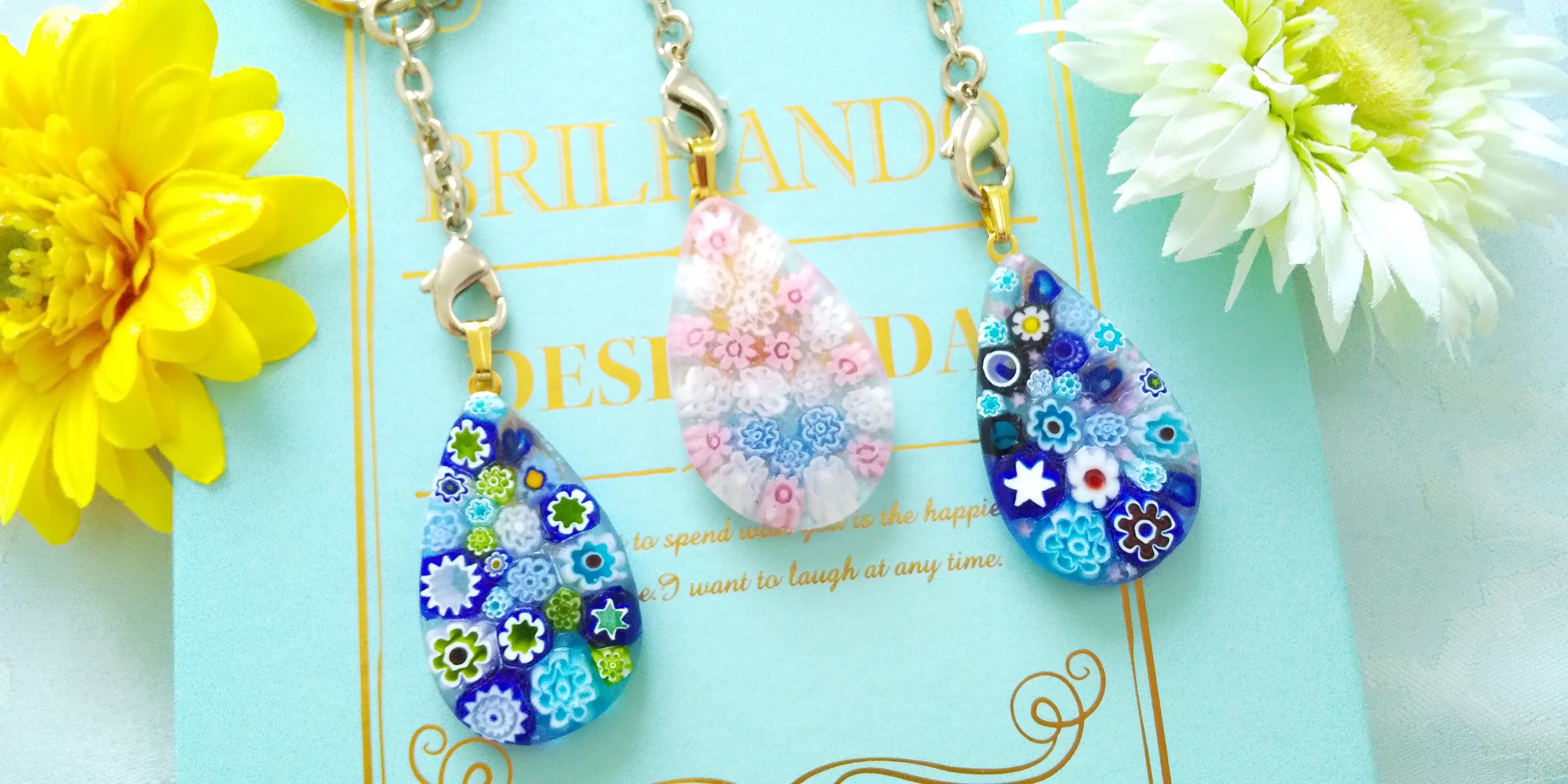 雫型にミルフィオリを彩った可愛らしいミルフィオリチャームになります。
