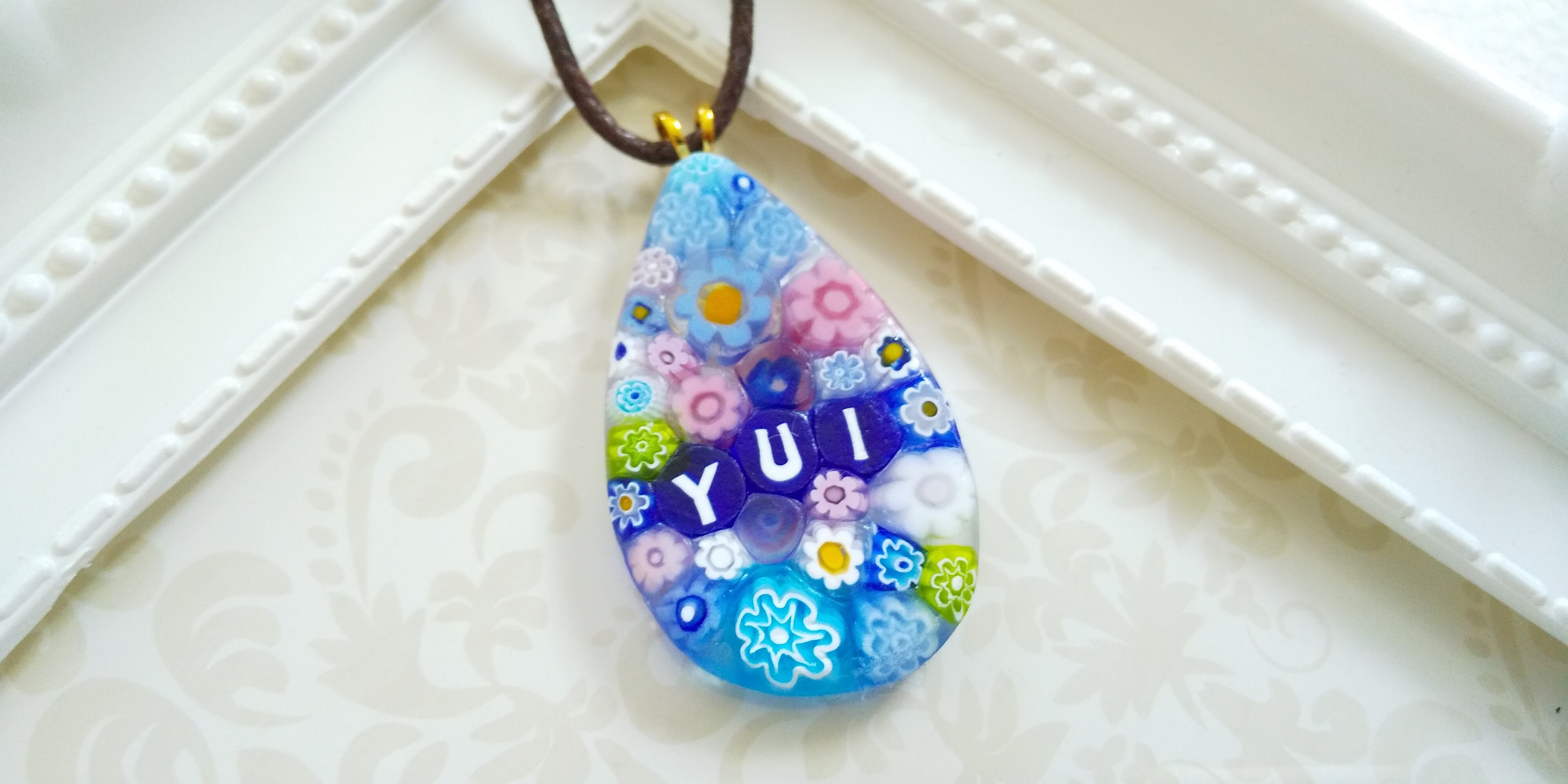 雫型にミルフィオリを彩った可愛らしいミルフィオリの名入りネックレスになります。