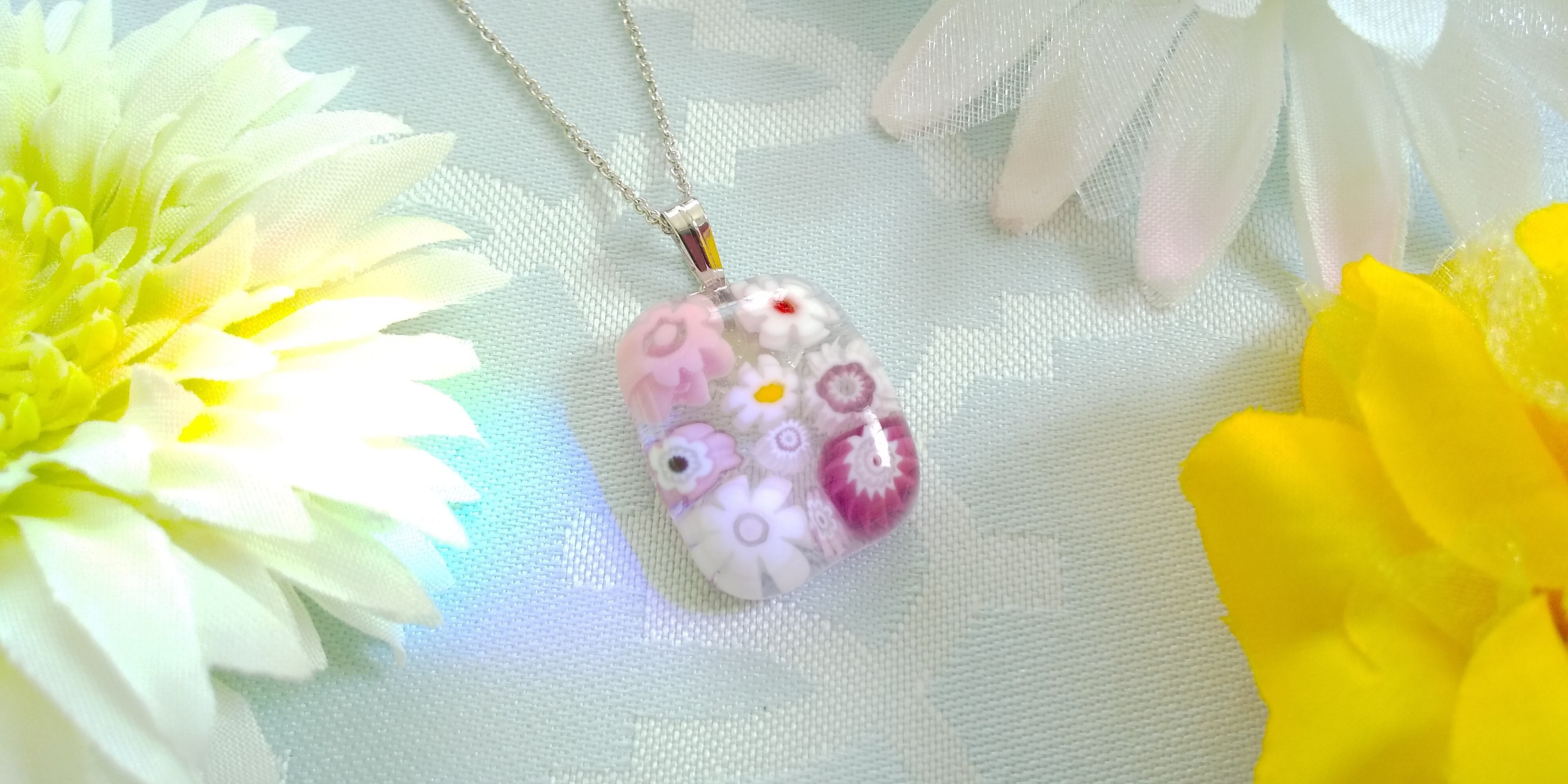 ピンク系のミルフィオリを彩った可愛らしいミルフィオリのネックレスになります。
