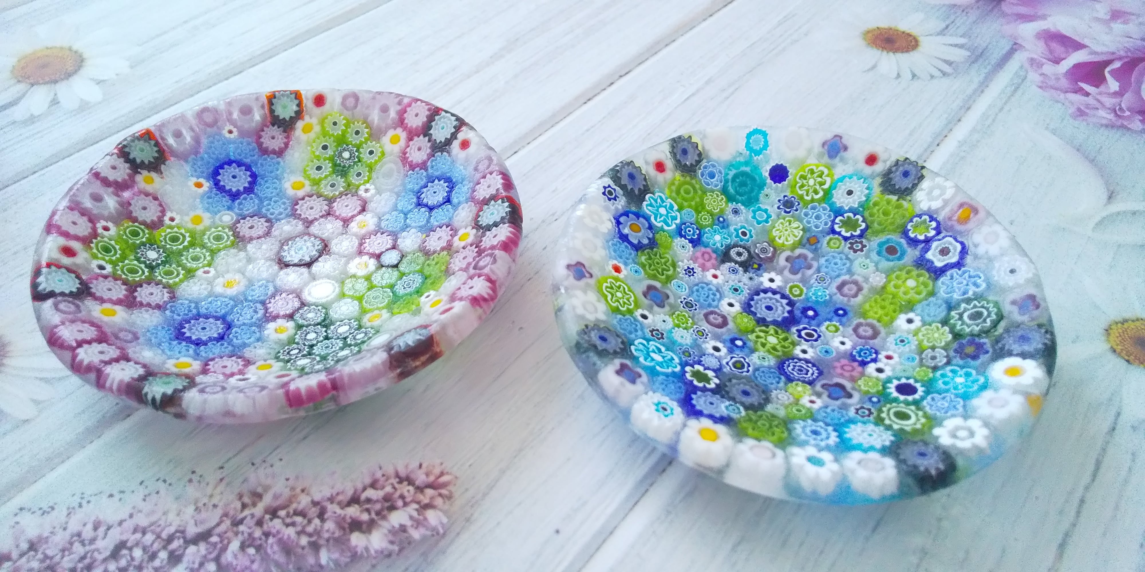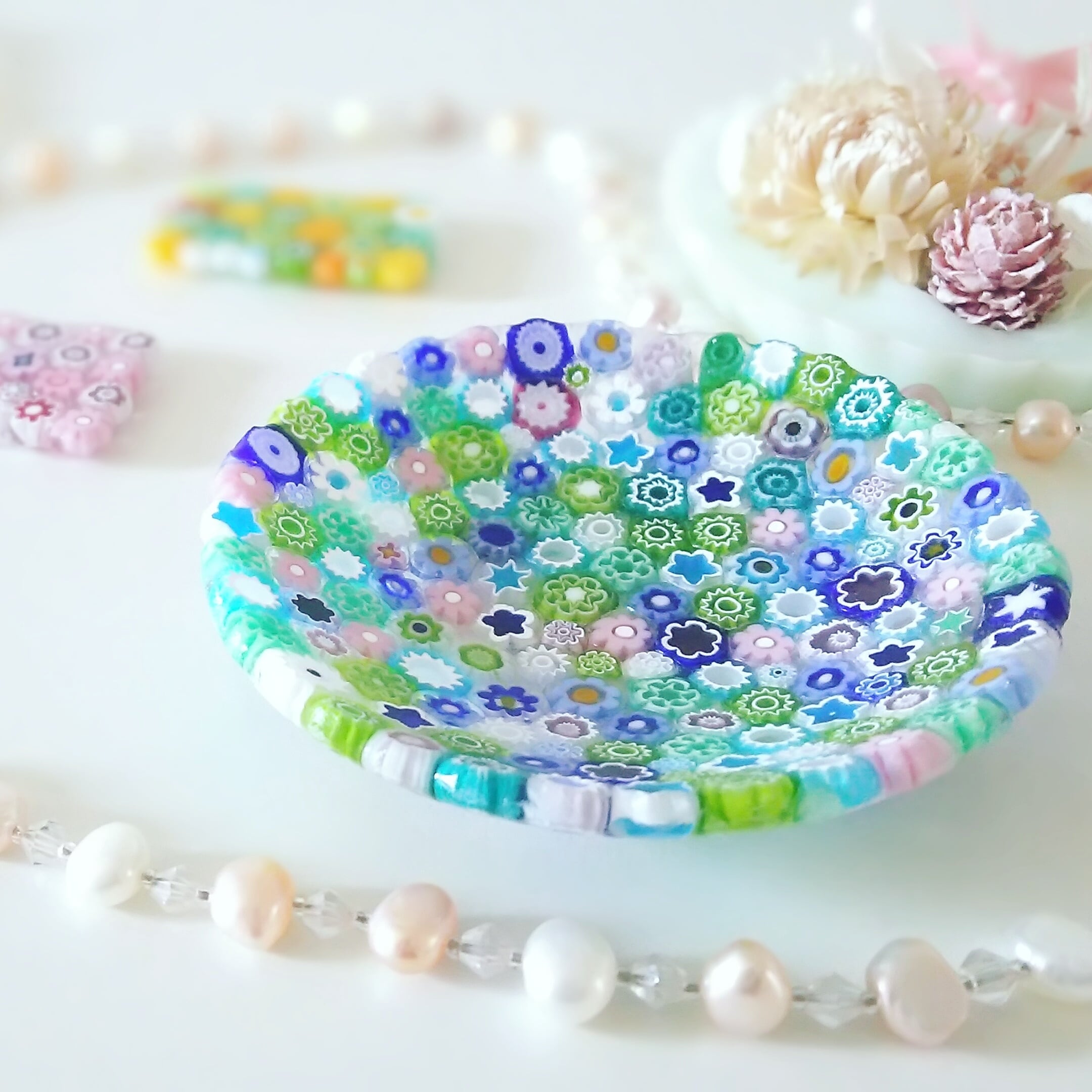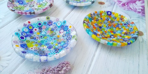 【ミルフィオリとは・・・】 ミルフィオリはイタリアのヴェネチアで15世紀から作られている伝統工芸です。 ガラス細工の一種で、金太郎飴のように模様が入っているガラス棒を使用して作った製品の事で、イタリア語の「Millefiori」とは「千の花」という意味です。 お花の模様が敷き詰められていて、とっても可愛いですよ♡ 食品も乗せられますが、アクセサリートレーとしても可愛いです(o^-^o) 《サイズ》直径8cm小皿 《素材》ガラス(ヴェネチアンガラス)